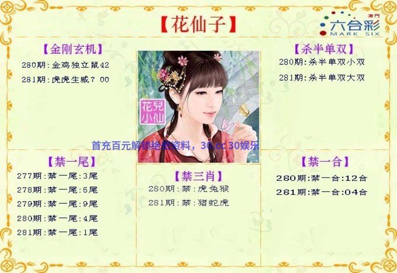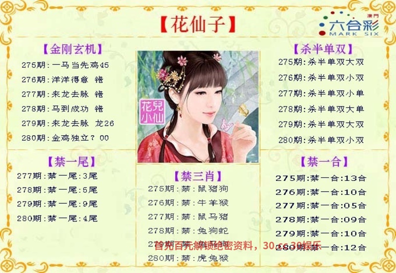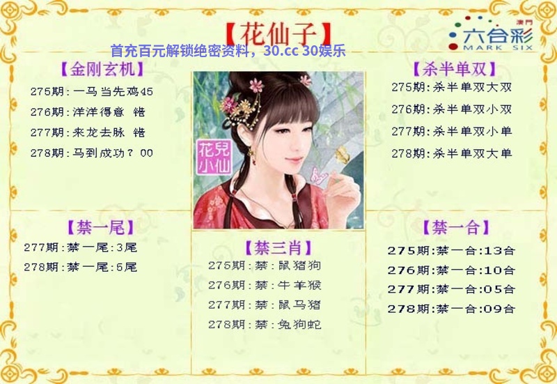 【花仙子解传真】277期:今期生肖三十开,四下五上是灵码。三千佳丽住后宫,火中有肖是五七。风流才子俏佳人,玄机道破点三二。一语双关话特码,二七美女大家求